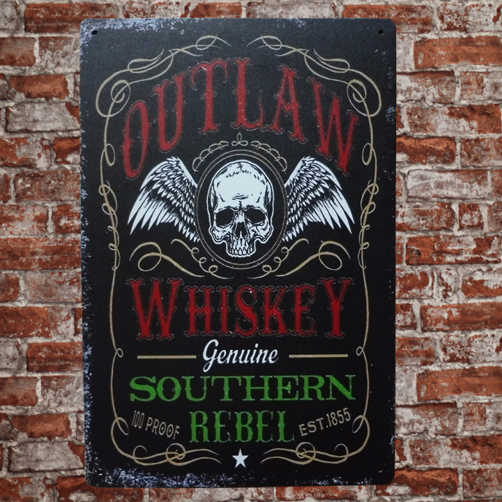 Geef je interieur een stoere look met het Outlaw Whiskey metalen bord van 20x30cm.