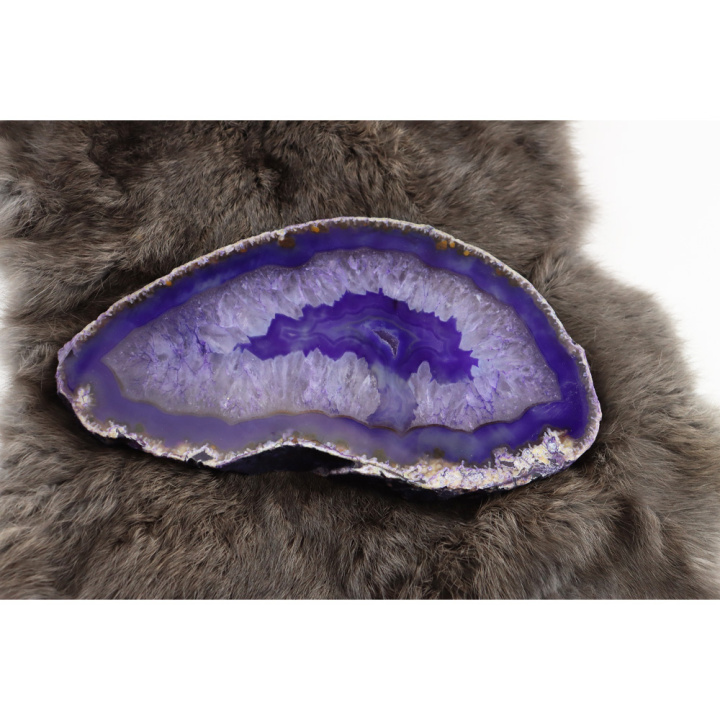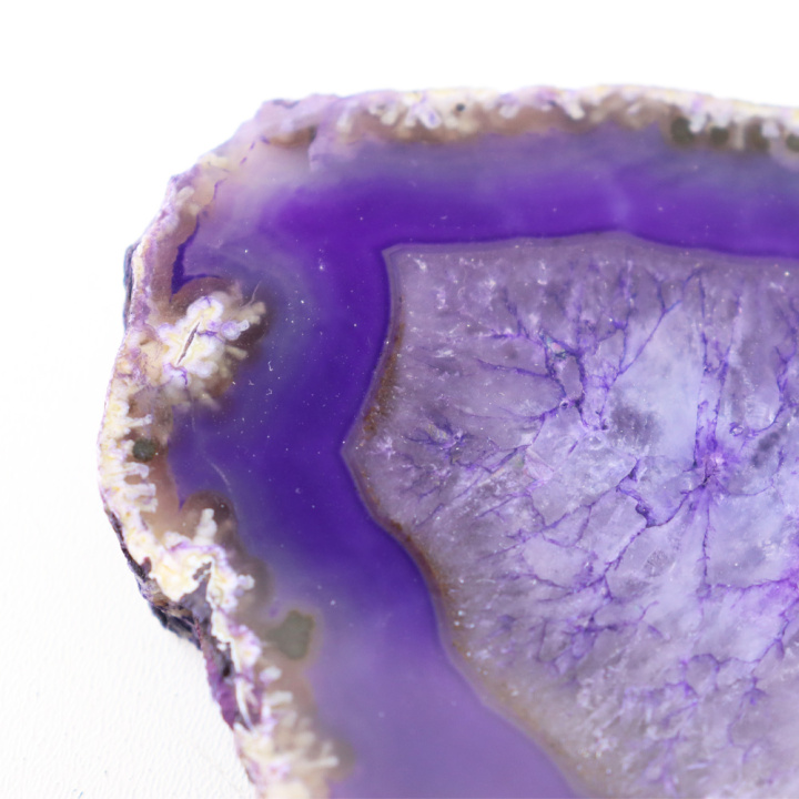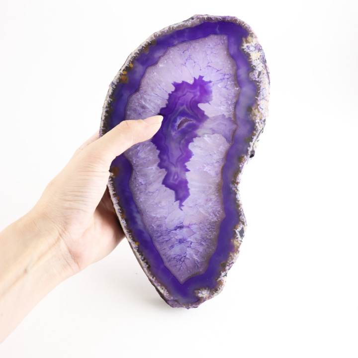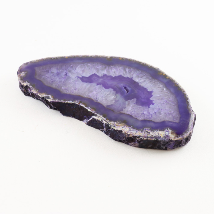 Agaat is een kwartsvariant die miljoenen jaren geleden is ontstaan in vulkanisch gesteente. De steen vormt zich uit lagen siliciumdioxide die zich afzetten in holtes van lava, waarbij kenmerkende lijnen en patronen ontstaan. De paarse kleur van deze agaatschijf is het resultaat van een kleurbehandeling, maar de steen zelf is 100% natuurlijk en met zorg gepolijst.