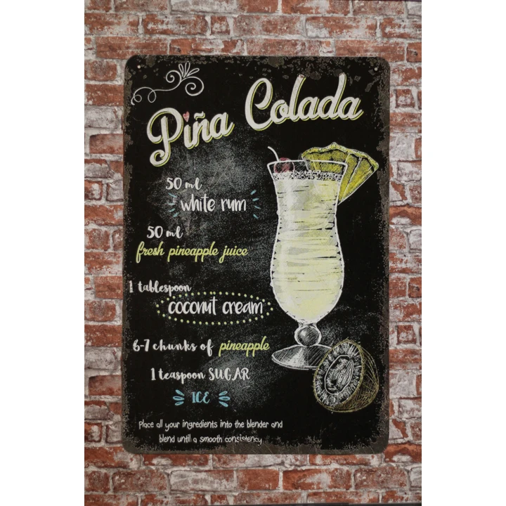Haal het ultieme zomergevoel in huis met dit vrolijke Pina Colada metalen bord van 20 x 30 cm. Of je nu je bar, keuken, terras of mancave wilt decoreren. Dit kleurrijke cocktailbord zorgt direct voor tropische sfeer. De opvallende cocktailafbeelding en speelse stijl maken dit bord tot een echte eyecatcher aan elke muur.