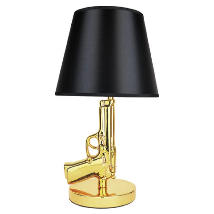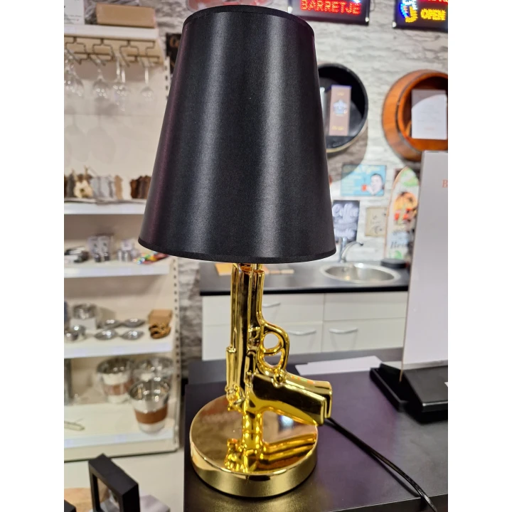 Deze unieke lamp heeft als stang een pistool. De gun lamp is goud van kleur met een zwarte kap.