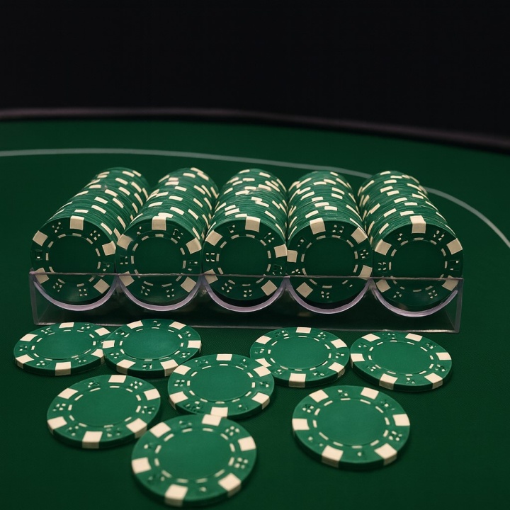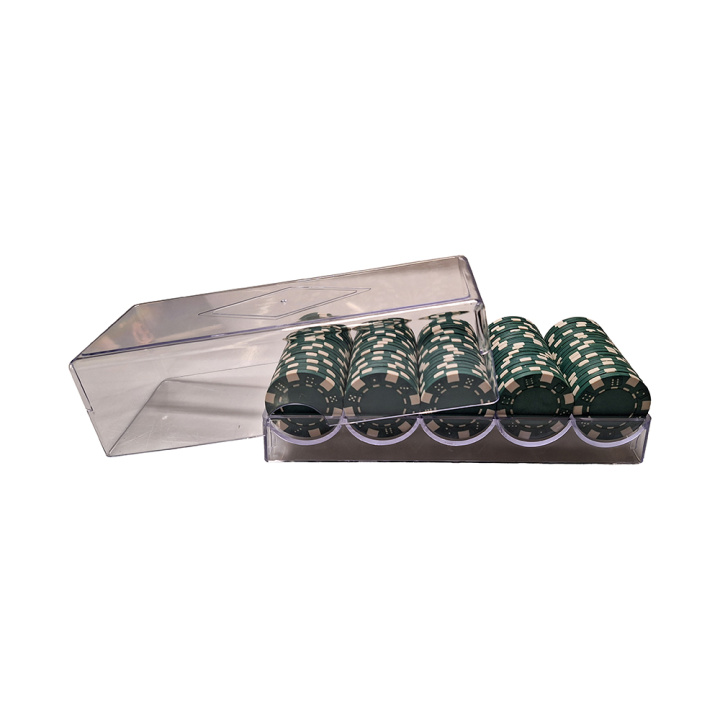 De chips worden standaard geleverd in een plastic bakje met 100 stuks Groene poker fiches.