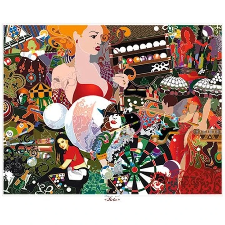 RETRO is een poster uit een serie van drie zeer kleurrijke en artistieke prenten, met elementen van pool, darts en nightlive.