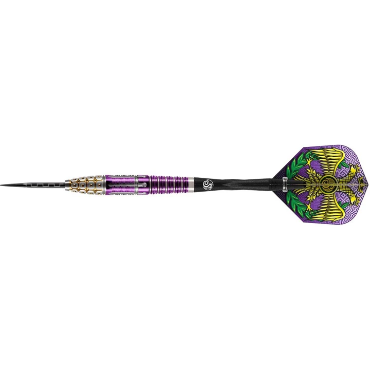 De dart eindigt met de Hilt-grip, een multi-directionele shark-grip die opnieuw is bewerkt om extra tractie toe te voegen waardoor de vingers in een antislipgebied worden vergrendeld hierdoor heeft u meer grip en gooit u constanter. Afgewerkt met een rijke en majestueuze paarse en gouden titaniumcoating voor kracht en schoonheid.