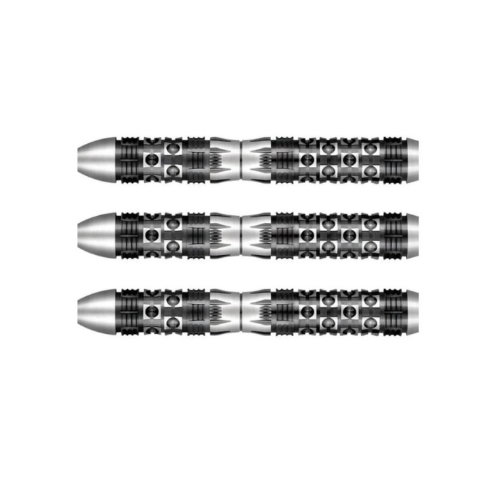Deze zilver-zwarte pijlen zijn gemaakt van 90% Tungsten en vallen op door de duidelijke inkeping in het midden van de barrel.