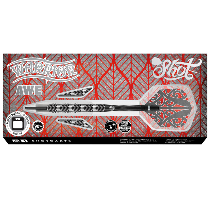 De Shot Warrior Awe 90% dartpijlen zijn gemaakt van 90% tungsten en hebben een geconcentreerd gewicht aan de voorkant voor extra controle.