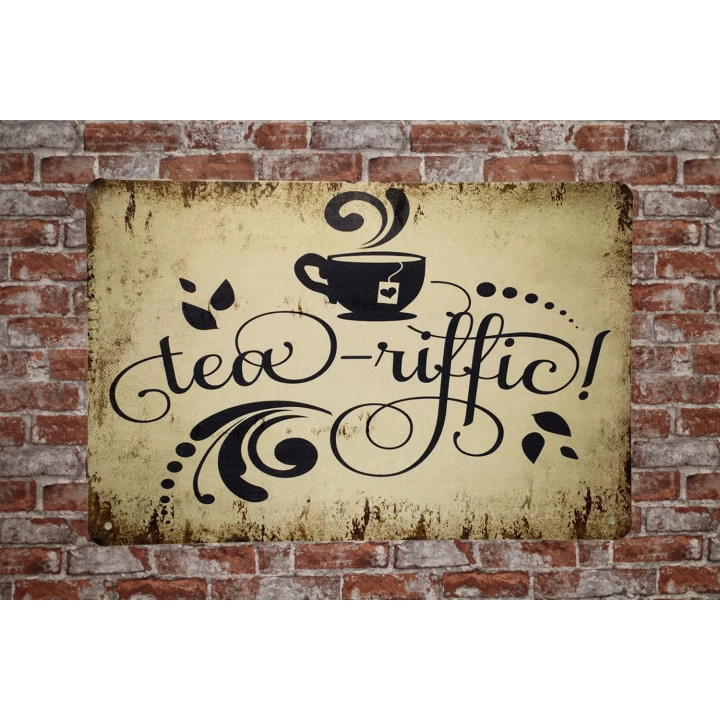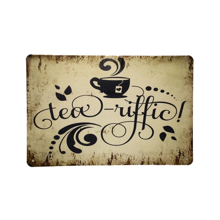 Het Tea Riffic Metalen bord is een vrolijk en sfeervol decoratiestuk voor iedere theeliefhebber. Met zijn formaat van 20 x 30 cm is het perfect om op te hangen in de keuken, woonkamer, thuisbar, café of buiten op het terras. De speelse tekst en het stijlvolle ontwerp maken dit bord een echte eyecatcher in je interieur of tuin.