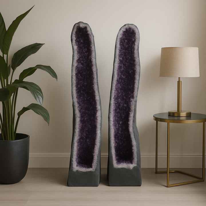 Deze geodes zijn echte statement pieces. Door hun hoogte en gewicht komen ze het best tot hun recht op de vloer of op een lage zuil.