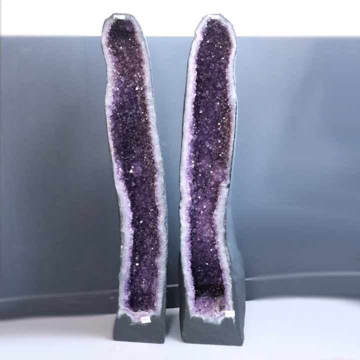 Beide geodes zijn voorzien van een stevige, vlakke onderkant en staan stabiel zonder extra ondersteuning. De kristallen zijn diep donkerpaars van kleur, een teken van hoge kwaliteit en sterke energetische werking.
