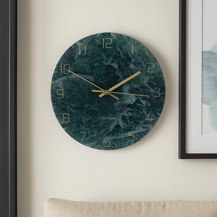 Ben je op zoek naar een stijlvolle wandklok groen die direct sfeer geeft aan je interieur? Deze moderne wandklok is uitgevoerd in een groene marmerlook en afgewerkt met goudkleurige cijfers en wijzers. De combinatie van kleur en design maakt deze klok een echte eyecatcher in je woonkamer, slaapkamer, thuiskantoor of keuken.