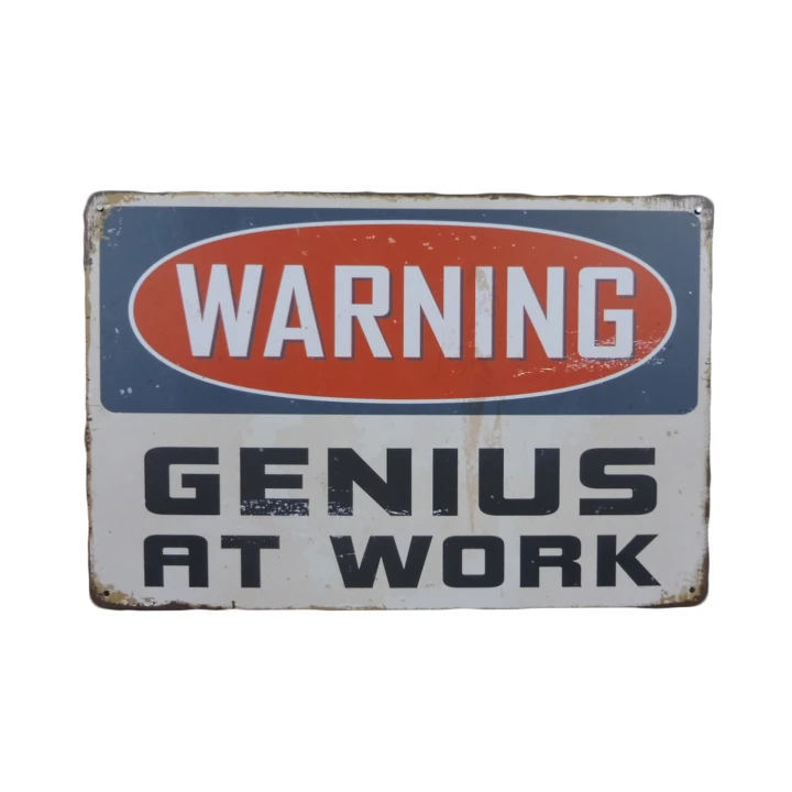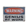 Warning Genius At Work Metalen borden is een bijzonder decoratiestuk / Wand decoratie voor aan uw muur. U kunt het bordje ophangen in bijvoorbeeld uw mancave, schuur, huis, bar, café, garage, werkplaats, buiten, hobby kamer of women cave.