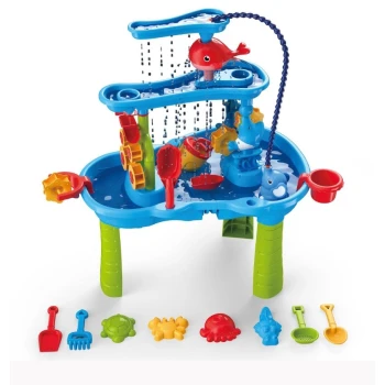 Bovenaan bevindt zich een ruim waterreservoir dat kinderen zelf kunnen vullen met de meegeleverde gieter. Zodra het water naar beneden stroomt, activeert het een speelse waterval met draaiende waterradjes en bewegende elementen, wat zorgt voor een magisch effect. Kinderen kunnen eindeloos gieten, scheppen en bouwen met de vrolijke accessoires die zijn inbegrepen.