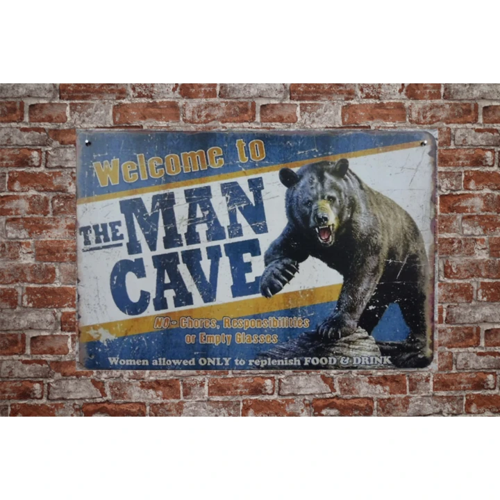 Welcome To The Mancave Metalen borden is een bijzonder decoratiestuk / Wand decoratie voor aan uw muur. U kunt het bordje ophangen in bijvoorbeeld uw mancave, schuur, huis, bar, café, garage, werkplaats, buiten, hobby kamer of women cave.