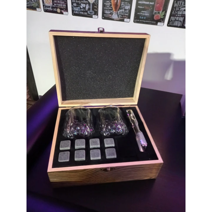 De set bevat 8 granieten whiskey stenen van 2 x 2 cm die je drank perfect koel houden zonder de smaak aan te tasten. De afgeronde hoeken beschermen je glas tegen beschadiging. Daarnaast bevat de set 2 elegante whiskeyglazen, een roestvrijstalen tang en een fluwelen zakje om de stenen netjes in op te bergen. Alles wordt geleverd in een luxe houten kist van 18 x 21,5 x 9 cm een stijlvolle toevoeging aan elke bar of mancave.