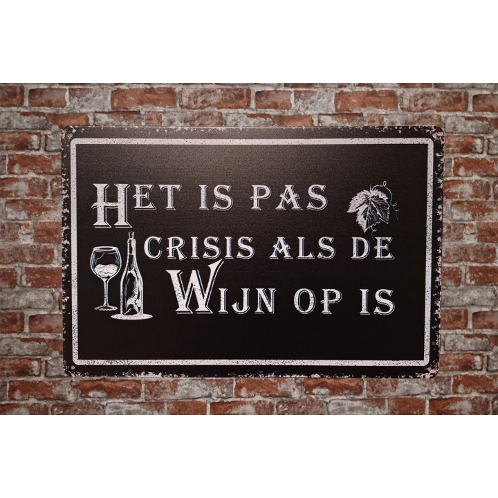 Het Wijn Crisis metalen bord (20×30 cm) is een grappige en sfeervolle toevoeging aan je interieur.