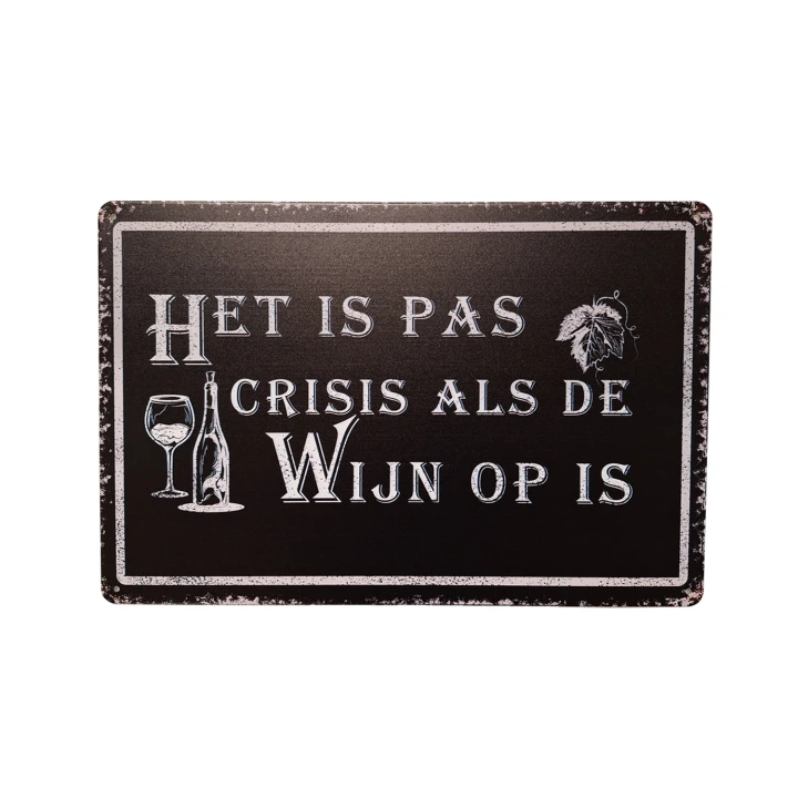 Metalen borden zijn niet alleen populaire wanddecoratie, maar ook een originele manier om karakter en persoonlijkheid aan je muurdecoratie toe te voegen. Het Wijn Crisis bord past perfect bij liefhebbers van grappige teksten en wijn, maar ook bij iedereen die houdt van unieke interieuraccenten.