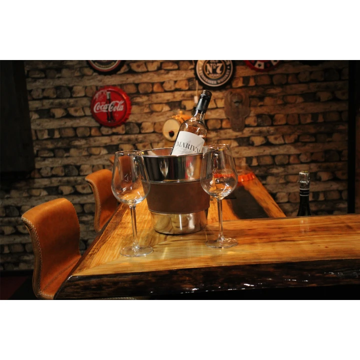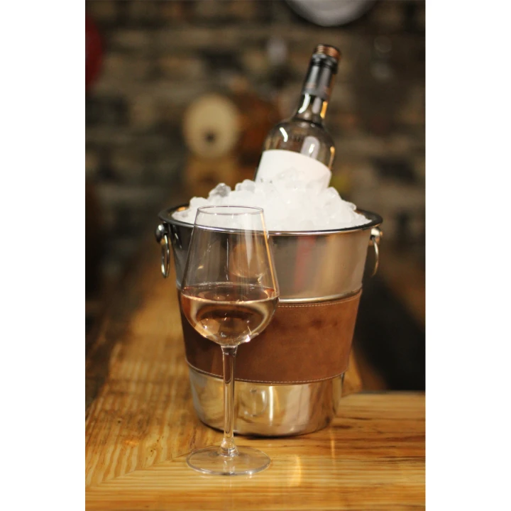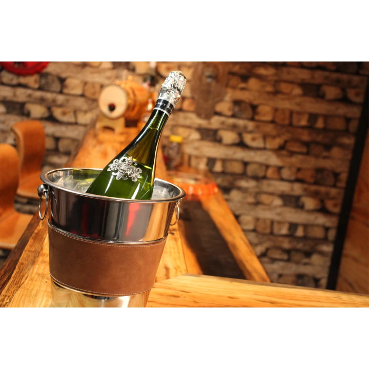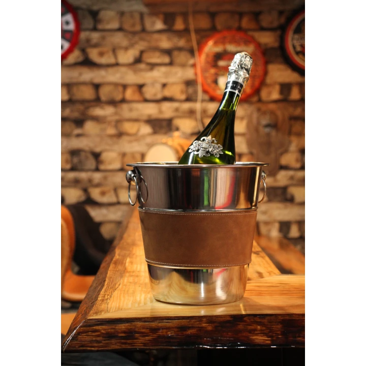 Met deze mooie Luxe Wijnkoeler van RVS kunt u wijn, bier of andere soorten drank langer koud houden en sfeervol uw drank op feesten en andere gelegenheden tentoonstellen. Het is gemaakt van RVS heeft oortjes zodra hij ook vast te maken is en een mooie leren middel stuk voor een robuuste look.