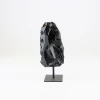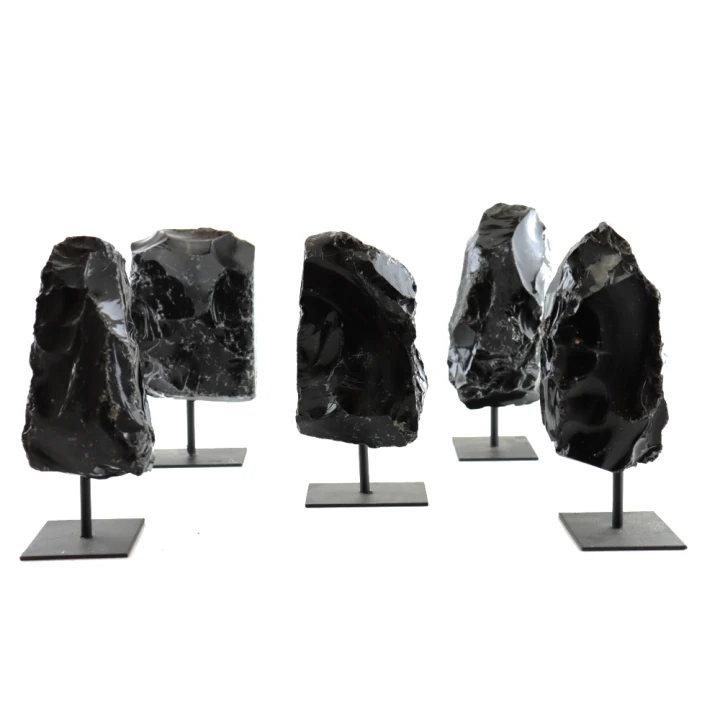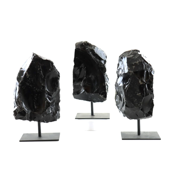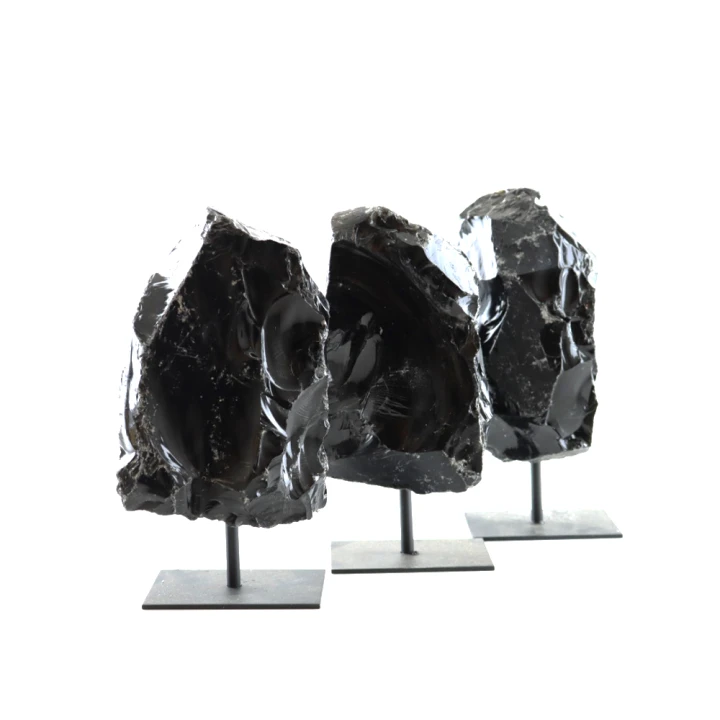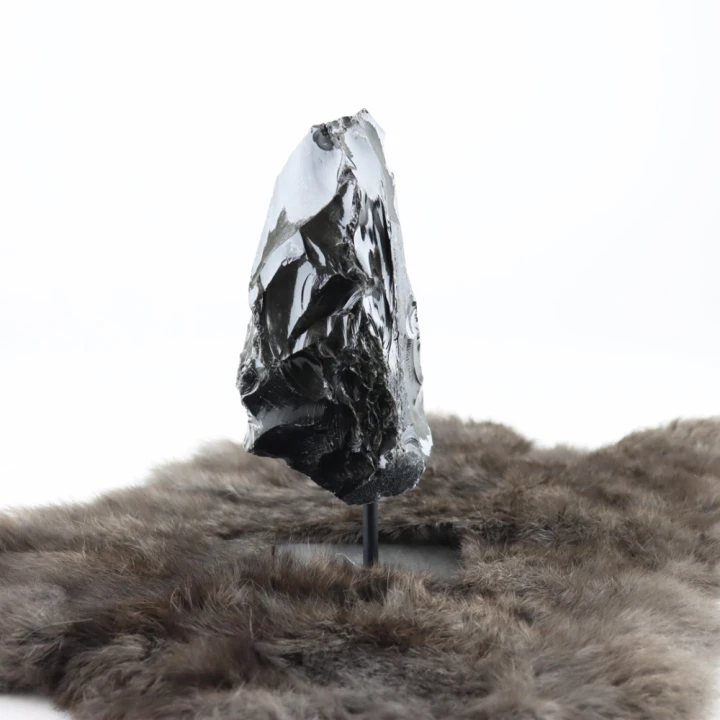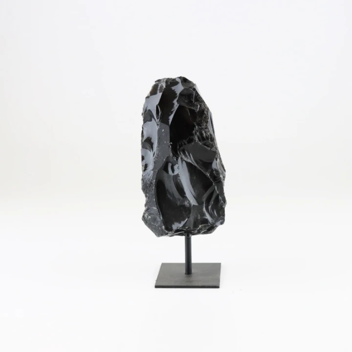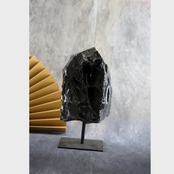 Stap in de mysterieuze wereld van zwarte obsidiaan op standaard, een krachtige vulkanische glasachtige steen met een rijke geschiedenis. Omdat het van lava is gemaakt, is het hard en broos, waardoor het gemakkelijk afbreekt.